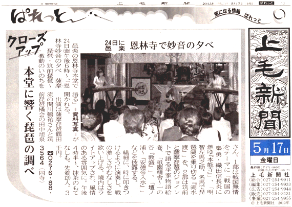 今回は、上毛新聞社様の本紙に掲載して戴けました。 恩林寺に関する箇所のみを編集させて戴きましたこと、 ご了承のことお願い申し上げます。 上毛新聞社様本紙は、全国版に近い重要事項も抜粋して 掲載して御座いますので、ご購読をお勧めいたします。 文責:編集局